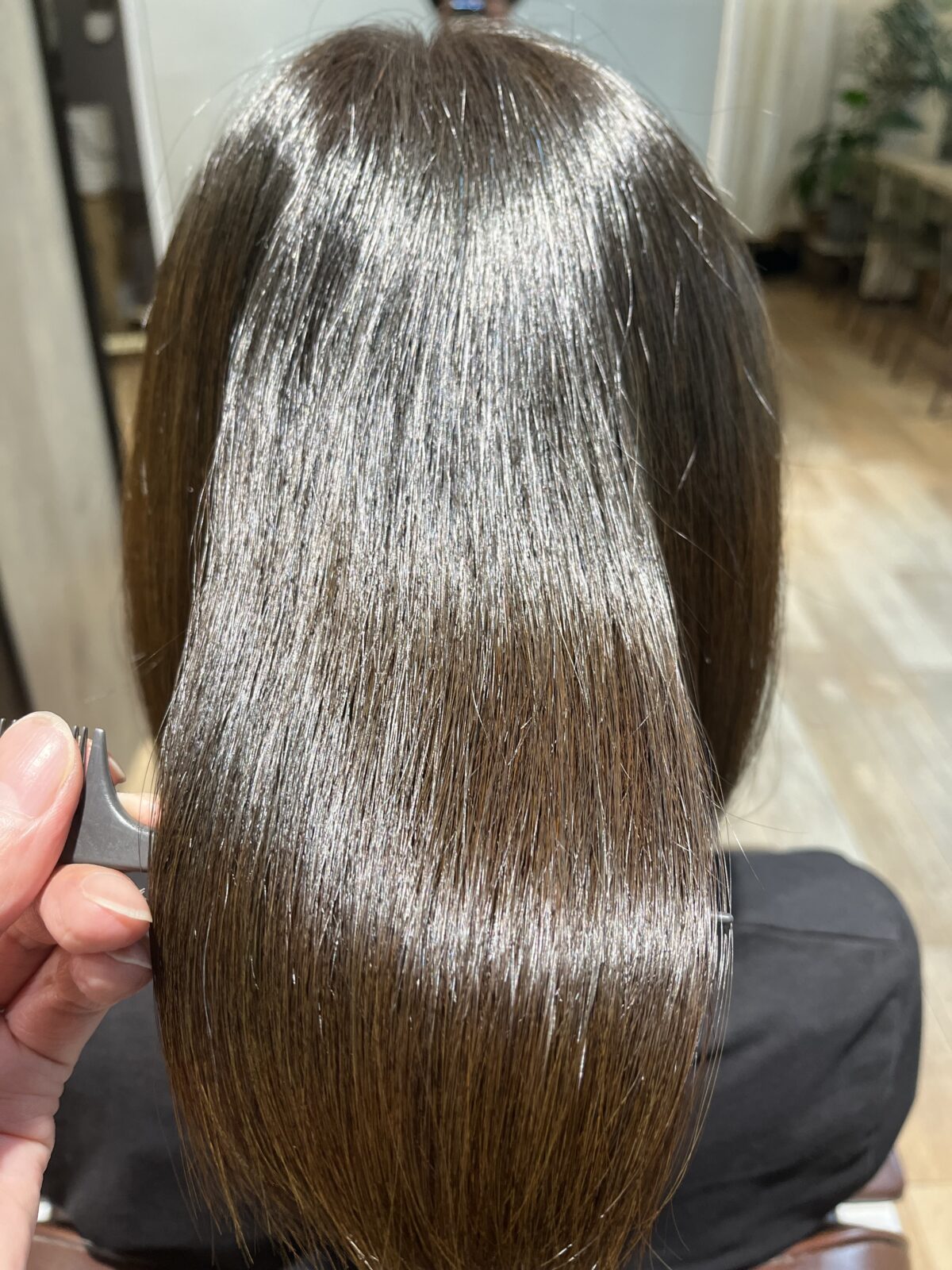 この状態になることで、今後カットで量を調整する場合でも、広がりにくく扱いやすい髪になります。